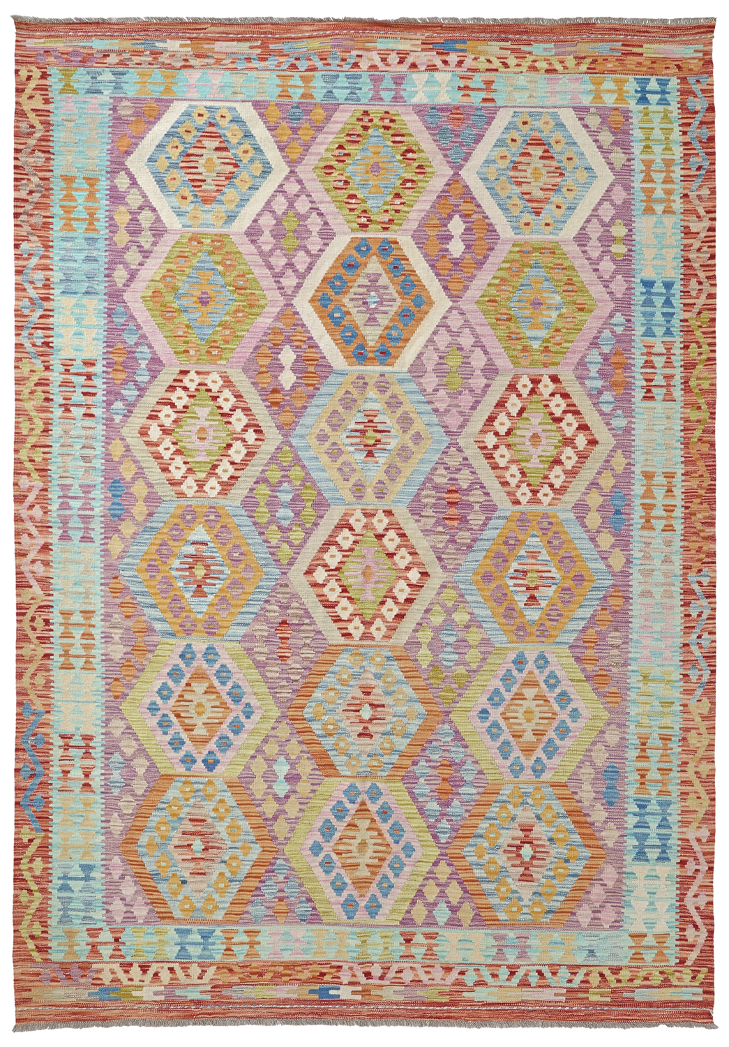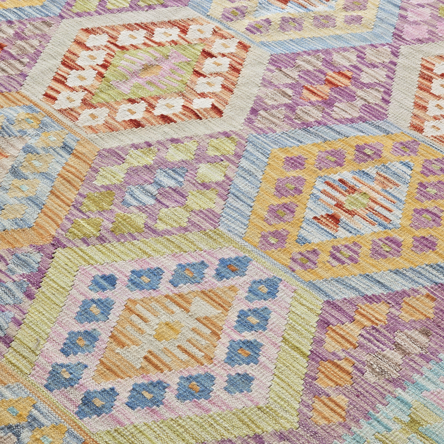 Orientalische Kelim‑Teppiche verbinden eine flachgewebte Struktur mit natürlicher Wolle – leicht, flexibel und einfach unter Tischen, in Fluren oder im Wohnzimmer zu platzieren. Das schlanke Profil eignet sich hervorragend zum Layering über größeren Teppichen.