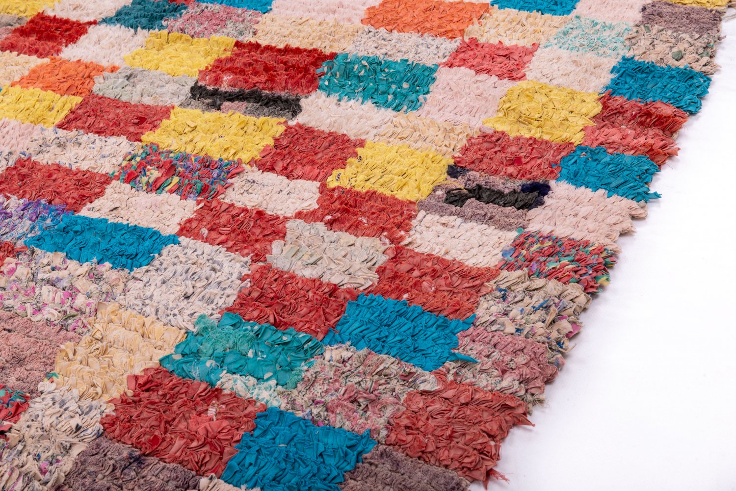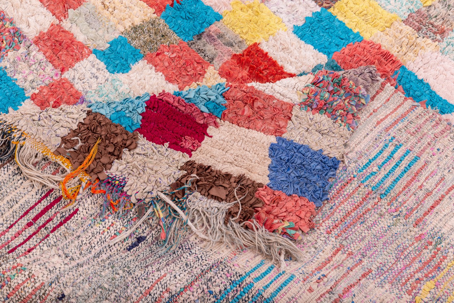 Der Boucherouite-Teppich reiht sich in die fantastischen Teppichkreationen ein, die aus Marokko kommen. Als Flickenteppich wird er aus gebrauchten Textilien wie Wolle, Garn, Kunstfasern und anderen Textilmaterialien hergestellt, die wiederverwertet werden können. Dieser wunderschöne marokkanische Flickenteppich ist das Ergebnis der Veränderungen, die in den letzten Jahren in Marokko auf dem Land stattgefunden haben, wo die herkömmlich nomadische Kultur fester Landwirtschaft und anderen Formen des Broterwerbs gewichen ist. Hierdurch ist die kostbare Schurwolle, das Material der Beni-Ourain- und Azilal-Teppiche, noch seltener geworden. Deswegen ist es umso wichtiger, gebrauchte Textilien wiederzuverwerten. Die marokkanischen Frauen auf dem Land haben hierin unvergleichliche Fähigkeiten entwickelt. Die Farben und das Muster des Boucherouite-Teppichs kennen wir bereits vom Azilal-Teppich. Beide Teppiche sind auf Kunstausstellungen weltweit zu sehen.